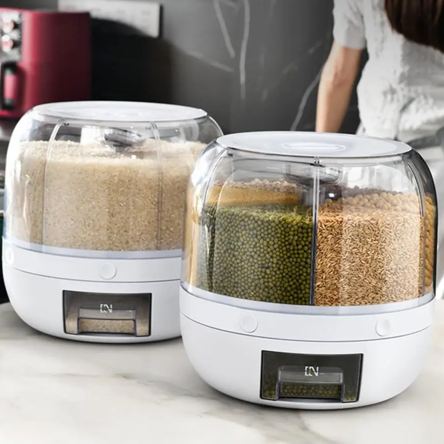 Com abertura rotativa e botão único, você acessa rapidamente arroz, cereais, feijões, café, farinha, nozes, frutas secas, açúcar e muito mais, sem derramar. O design de múltiplos compartimentos cria uma divisão detalhada que reduz a mistura de aromas e facilita a rotina. A transparência do corpo permite ver o conteúdo e o nível de cada seção, evitando compras duplicadas. Resultado: cozinha funcional e visualmente harmônica todos os dias. 🧺