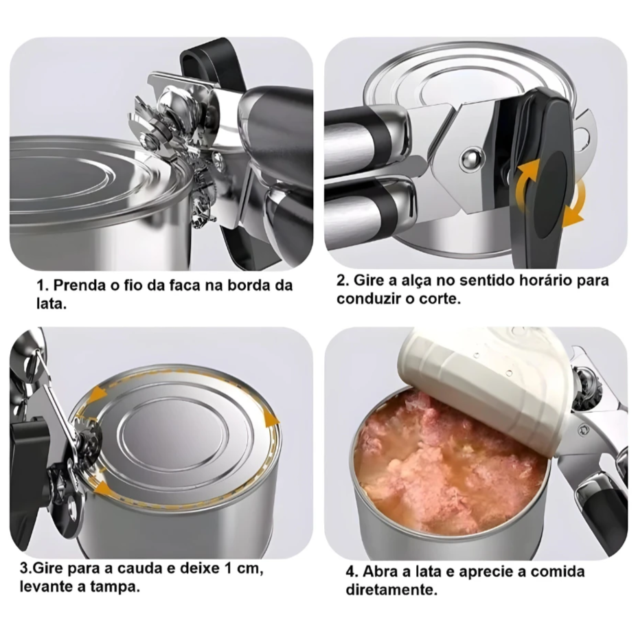 Pensado para velocidade e precisão, este abridor multifuncional une praticidade e controle em um único utensílio. O mecanismo de giro suave abre a lata de forma limpa, sem rebarbas, enquanto o abridor de garrafas integrado agiliza sua rotina. A operação é intuitiva: fixe, gire e sirva — do preparo ao brinde em poucos movimentos. 🔄